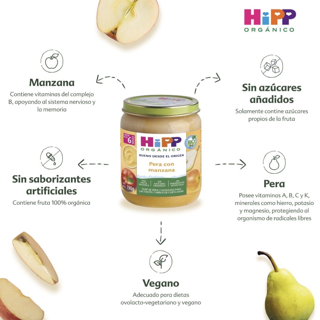 Papilla Orgánica de Pera con Manzana. Sin azúcares añadidos, colorantes, ingredientes genéticamente modificados, conservadores. Producto vegetariano y vegano. La manzana contiene vitaminas del complejo B, apoyando al sistema nervioso y la memoria. La pera posee vitaminas A, B, C y K, minerales como hierro, potasio y magnesio, protegiendo al organismo de radicales libres. El número en el borde de la tapa permite rastrear cada ingrediente individualmente hasta su origen.